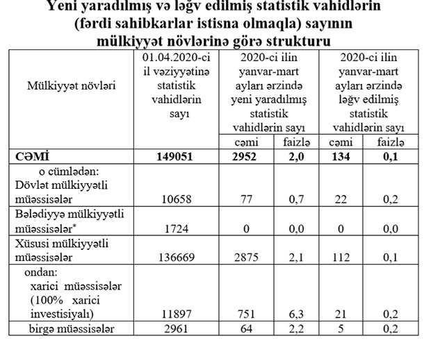 2020-ci ilin yanvar-mart ayları ərzində yeni yaradılmış statistik vahidlərin 97,4 faizi xüsusi mülkiyyətli (o cümlədən 25,4 faizi tam xarici investisiyalı, 2,2 faizi birgə mülkiyyətli), 2,6 faizi isə dövlət mülkiyyətli müəssisələrin payına düşür.
