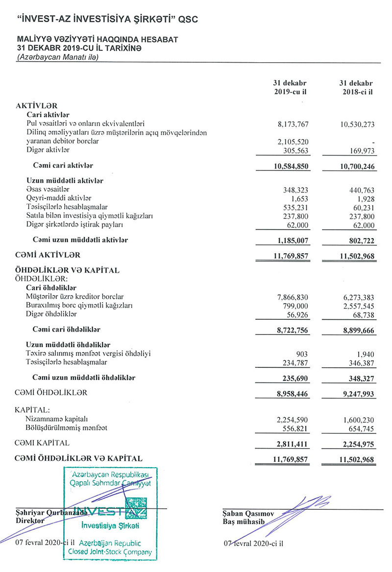 31 Dekabr 2019-cu il tarixində İnvestAZ 11 milyon 770 min manat cəmi aktivlərə malik olub, bu, 2018-ci illə müqayisədə 266 min manat və ya 2,3% çoxdur.