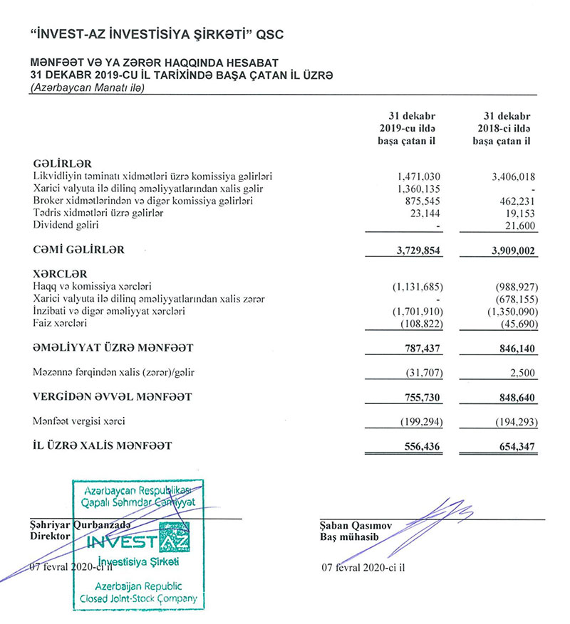 Müqayisə üçün qeyd edək ki, 2018-ci ildə İnvest AZ-ın cəmi əməliyyat gəlirləri 3 milyon 909 min manat, cəmi əməliyyat xərcləri 3 milyon 62 min manat, əməliyyat mənfəəti 846 min manat, xalis mənfəəti isə 654 min manat təşkil etmişdi.