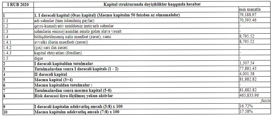 Müqayisə üçün qeyd edək ki, 2019-cu ilin 1-ci rübündə AFB Bankın cəmi əməliyyat mənfəəti 9 milyon 685 min manat, cəmi əməliyyat xərcləri 5 milyon 442 min manat, əməliyyat mənfəəti 4 milyon 243 min manat təşkil etmişdi. Bank mümkün zərərlər üçün yaradılan məqsədli ehtiyatlara 4 milyon 133 min manat ayırdığı üçün həmin dövrü 111 min manat xalis mənfəət ilə başa vurmuşdu.