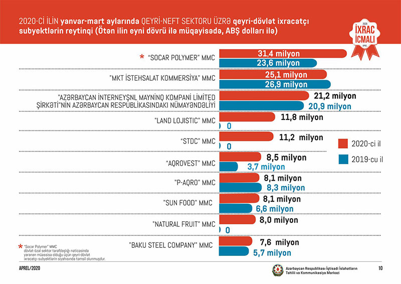 Marja xəbər verir ki, “İxrac İcmalı”nın aprel sayında qeyri-neft sektoru üzrə əsas ixracatçı şirkətlərin reytinqi verilib. Bu ilin yanvar-mart ayları üzrə hazırlanan qeyri-dövlət ixracatçı subyektlərin reytinqində ilk onluqda aşağıdakı şirkətlər təmsil olunurlar: “Socar Polymer” MMC, "MKT İstehsalat Kommersiya" MMC, "Azərbaycan İnterneyşnl Mayninq Kompani Limited Şirkəti"nin Azərbaycan Respublikasındakı nümayəndəliyi, "Land Lojistic" MMC, “STDC” MMC, "Aqrovest" MMC, "P-Aqro" MMC, "Sun Food" MMC, "Natural Fruit" MMC," "Baku Steel Company".