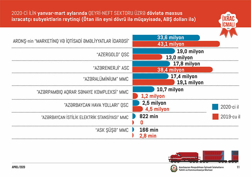 Qeyri-neft sektoru üzrə ixrac əməliyyatlarında iştirak edən və 100 min ABŞ dollarında çox ixrac həyata keçirən dövlətə məxsus şirkətlərin siyahısına isə ARDNŞ-nin “Marketinq və İqtisadi Əməliyyatlar İdarəsi” başçılıq edir. Daha sonra bu siyahıda aşağıdakı şirkətlər təmsil olunurlar: "Azergold" QSC, "Azərenerji" ATSC, "Azəralüminium" MMC, "Azərpambıq Aqrar Sənaye Kompleksi" MMC, "Azərbaycan Hava Yolları" QSC, "Azərbaycan İstilik Elektrik Stansiyası" MMC, “ASK şüşə” MMC.