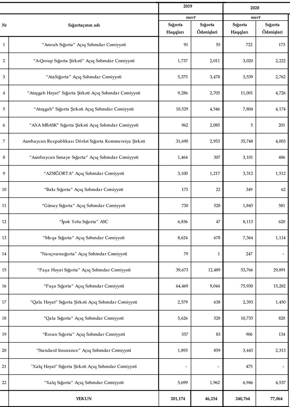 2019-cu ilin ilk 3 ayı ilə müqayisədə 2020-ci ilin ilk 3 ayında Azərbaycanın 22 sığorta şirkətindən 5-nin (AtaSığorta, Atəşgah Sığorta, AXA MBask, Meqa Sığorta, Qala Həyat ) hesabladığı sığorta haqları azalıb,16-sının isə artıb.