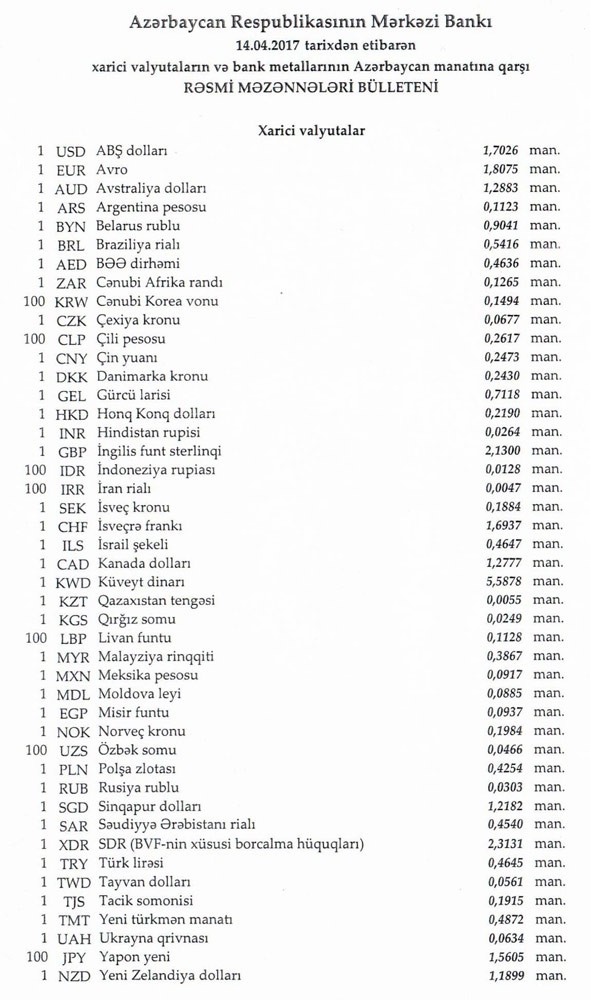 Aprelin 14-nə Mərkəzi Bankın açıqladığı rəsmi Dollar/manat məzənnəsi Aprelin 13-ü ilə müqayisədə düşərək 1,7026 manat olub, Avro/manat məzənnəsi isə 1.8075 manata düşüb .