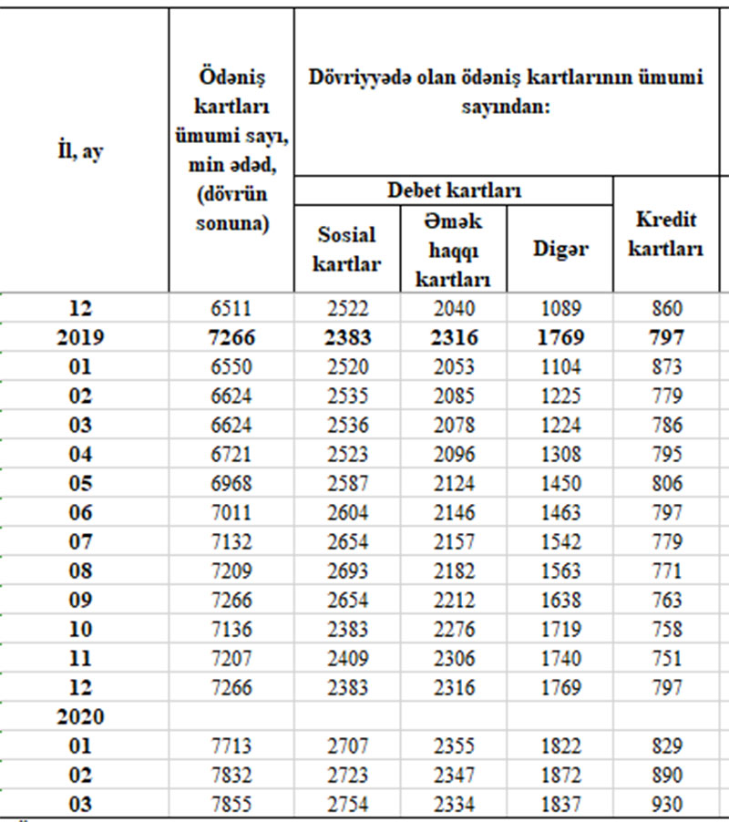 2020-ci ilin Mart ayının sonunda Azərbaycanda cəmi ödəniş kartlarının sayı 7 milyon 855 min ədəd təşkil edib.