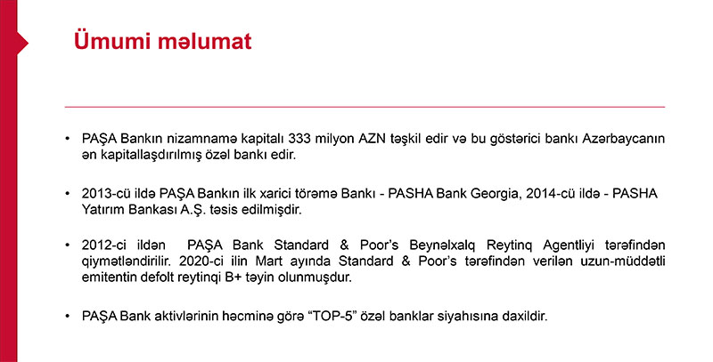 Bu gün keçirilən veb-konfransda PAŞA Bankın İdarə Heyətinin sədri Taleh Kazımov və İdarə Heyətinin üzvü, Baş Maliyyə inzibatçısı Bəhruz Nağıyev maliyyə göstəricilərini açıqlayıblar.