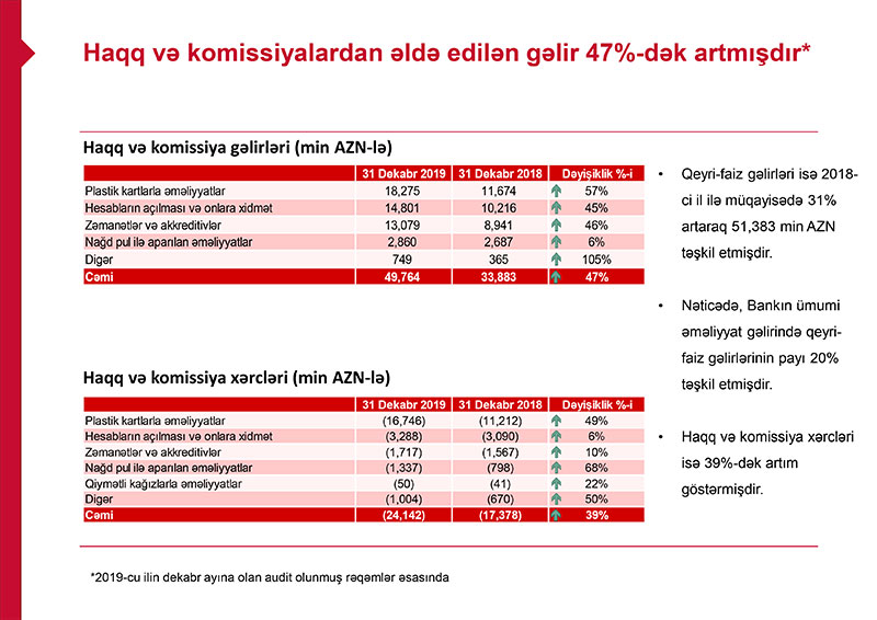 2018-ci illə müqayisədə 2019-cu ildə PAŞA Bank qrupunun faiz gəlirləri 28 milyon 688 min manat və ya 12,6% artaraq 257 milyon 103 min manata, qeyri-faiz gəlirləri isə 12 milyon 115 min manat və ya 30,8% artaraq 51 milyon 383 min manata yüksəlib. Ötən il Bankın cəmi faiz və qeyri-faiz gəlirləri 40 milyon 803 min manat artıb.