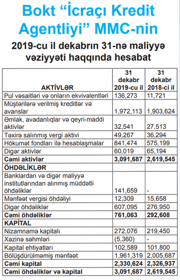 BOKT “İcraçı Kredit Agentliyi” MMC rəsmi qəzetlərdən birində 2019-cu il dekabrın 31-nə maliyyə vəziyyəti haqqında hesabatını dərc etdirib.