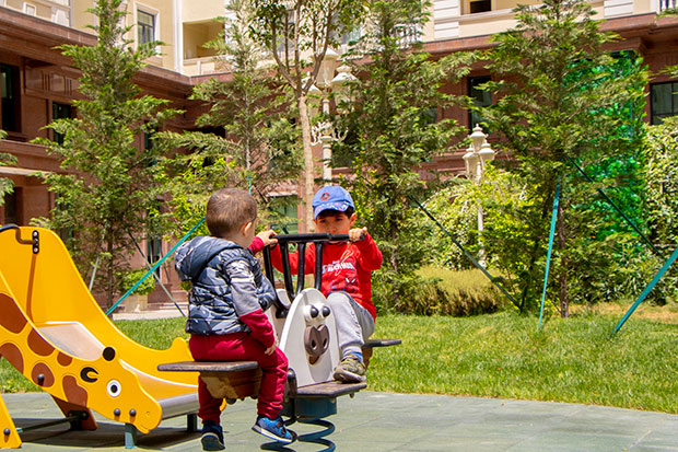Valideynlər uşaq meydançalarında övladları ilə birlikdə asudə vaxtlarını keçirə bilirlər. Xüsusi nəzarət sistemi hesabına yad insanların kompleksə birbaşa girişi və çıxışı yalnız icazə əsasındadır. “Renessans Palace”da, həmçinin, sakinlərin rahatlığını və təhlükəsizliyini tam təmin etmək üçün “Avtomobilsiz həyət” prinsipi də əsas götürülərək aktiv zonaya avtomobillərin girişinə tam qadağa qoyulub. Həm sakinlərin özləri, həm də onların qonaqları üçün nəzərdə tutulan 3 mərtəbəli yeraltı qaraj isə məhz “avtomobilsiz həyat” yanaşmasını insanların rahatlığını pozmadan tətbiq etməyə imkan verir.