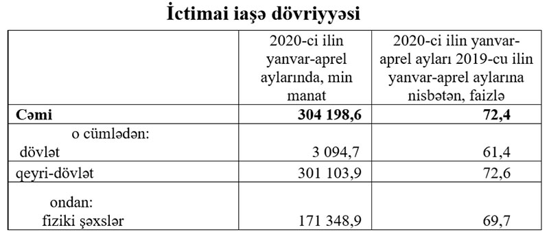 Belə ki, cari ilin aprel ayında ictmia iaşə dövriyyəsi əvvəlki ayla müqayisədə 2,3 dəfə, ötən ilin aprel ayı ilə müqayisədə isə 4,0 dəfə azalmışdır. Nəticədə ictimai iaşə xidmətlərinin həcmi ötən ilin yanvar-aprel ayları ilə müqayisədə 27,6 faiz azalaraq 304,2 milyon manat olmuşdur.