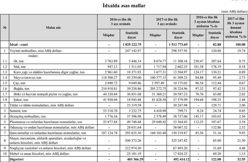 Dövlət Gömrük Komitəsinin digər bir məlumatına görə, bu ilin yanvar mart aylarında idxal ötən ilin anoloji dövrü ilə müqayisədə 17.12 % və ya 312 milyon 449 min dollar azalaraq 1 milyard 513 milyon ABŞ dolları təşkil edib.