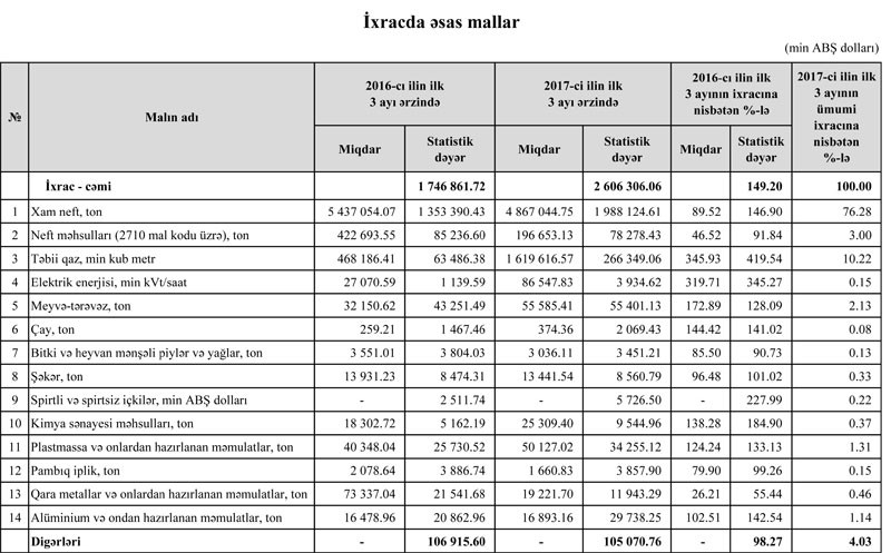 Xəbər verdiyimiz kimi, bu ilin birinci rübündə Azərbaycanın ixracı ötən ilin anoloji dövrü ilə müqayisədə təxminən 859 milyon manat və ya 49,2% artaraq 2 milyard 606 milyon ABŞ dolları təşkil edib.