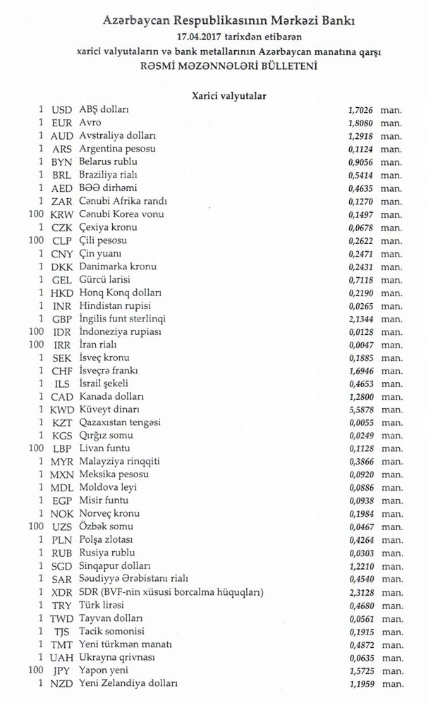 Aprelin 17-nə Mərkəzi Bankın açıqladığı rəsmi Dollar/manat məzənnəsi Aprelin 14-ü ilə müqayisədə dəyişməyərək 1,7026 manat olub, Avro/manat məzənnəsi isə 1.8080 manata qalxıb.