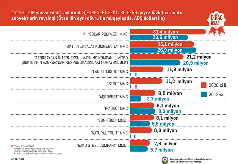 Marja xəbər verir ki, “İxrac İcmalı”nın may sayında qeyri-neft sektoru üzrə əsas ixracatçı şirkətlərin reytinqi verilib. Bu ilin yanvar-aprel ayları üzrə hazırlanan qeyri-dövlət ixracatçı subyektlərin reytinqində ilk onluqda aşağıdakı şirkətlər təmsil olunurlar: “Socar Polymer” MMC, "Azərbaycan İnterneyşnl Mayninq Kompani Limited Şirkəti"nin Azərbaycan Respublikasındakı nümayəndəliyi, "MKT İstehsalat Kommersiya" MMC, "Land Lojistic" MMC, "Sun Food" MMC, “STDC” MMC, "Aqrovest" MMC, "Natural Fruit" MMC," "Baku Steel Company" və "P-Aqro" MMC.