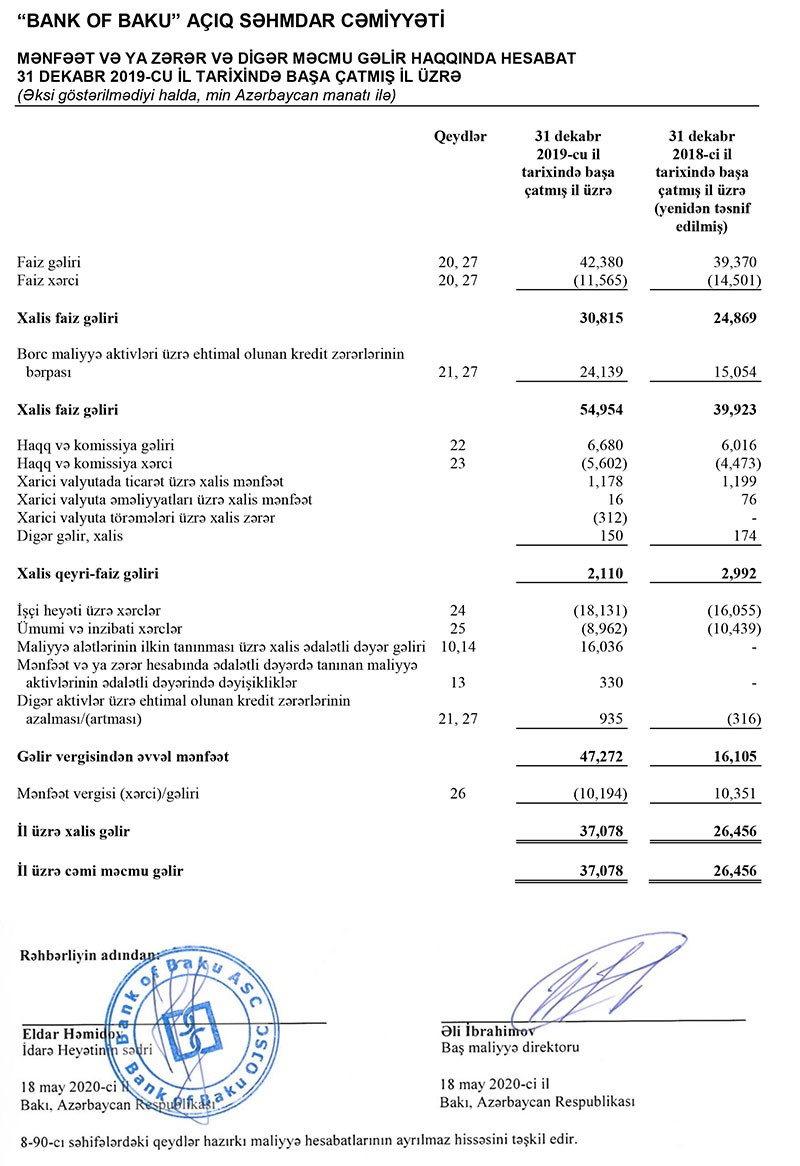 “Bank of Baku” ASC 2019-cu il üzrə Beynəlxalq Maliyyə Hesabatı Standartlarına uyğun hazırlanmış maliyyə hesabatlarını dərc edib. Hesabatdan məlum olur ki, ötən il “Bank of Baku”nun yığılmış zərəri tamamilə bağlanmış, 2018-ci ildə minimal tələbdən aşağı olmuş cəmi kapitalı 2 dəfə artaraq tələbə artıqlaması ilə cavab vermiş, Bankın biznesi aktivləşmiş, müştərilərə verilmiş kreditlər artmış, kreditlərin artması ilə bankın gəlirləri də artmışdır.XALİS MƏNFƏƏTİ KƏSKİN ARTIB