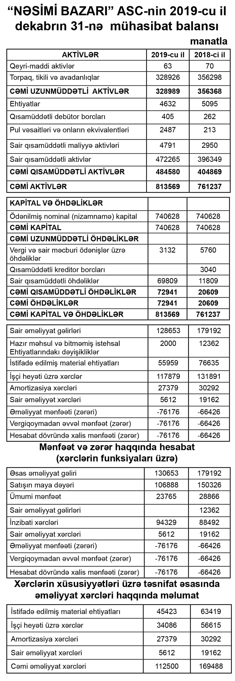 “Nəsimi Bazarı” ASC 2019-cu ili 76 min 176 manat xalis zərər ilə başa vurub, bu, 2018-ci illə müqayisədə 15% çoxdur. ASC 2018-ci ili 66 min 426 manat xalis zərər ilə bağlamışdı.
