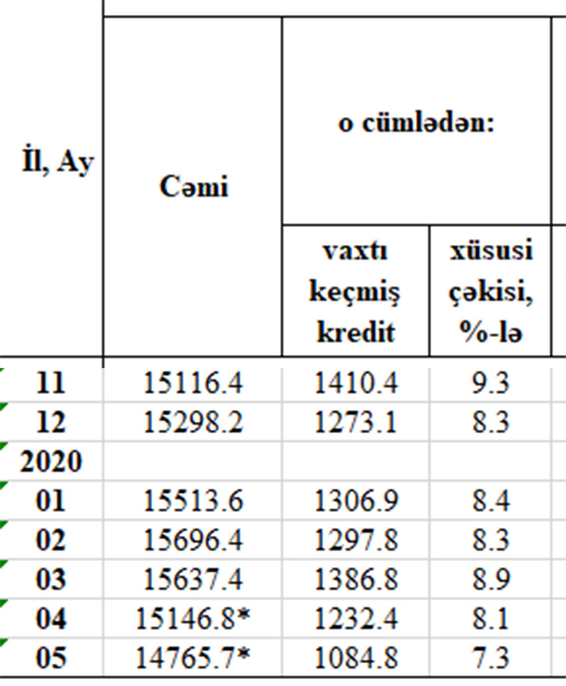 Mayın sonunda 14 milyard 765,7 milyon manatlıq kredit qoyuluşlarının 7,3%-nin ödəmə vaxtı keçib. Aprelin sonunda bu nisbət 8,1% idi.