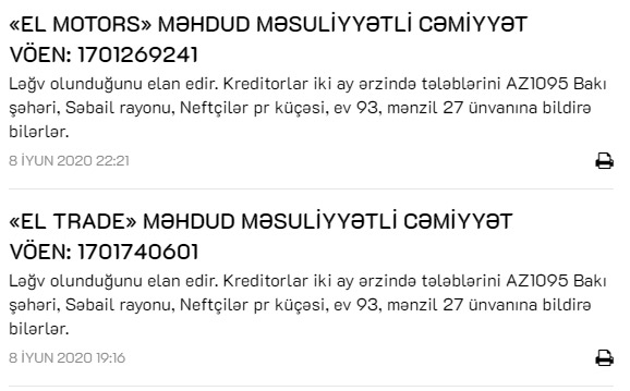 Bir müddət əvvəl "El Motors" MMC və "El Trade" MMC ləğv olunduqlarını elan etmişdilər.