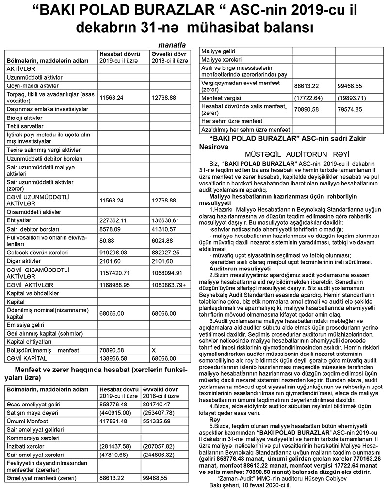 “Bakı Polad Burazlar” ASC 2019-cu ili 70 min 890 manat xalis mənfəət ilə başa vurub. 2018-ci illə müqayisədə ASC-nin xalis mənfəəti 8 min 684 manat və ya 11% azalıb.