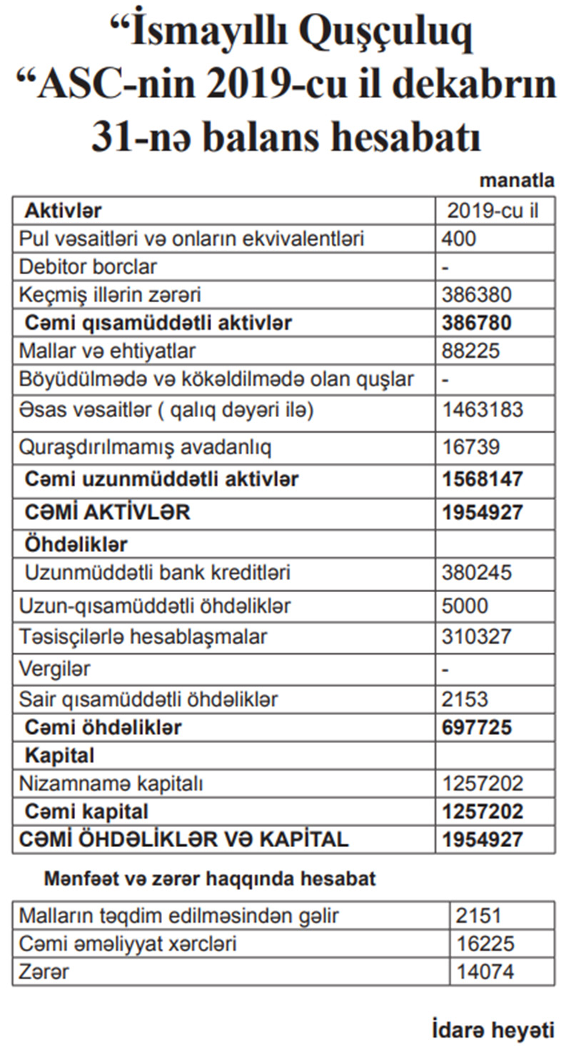 “İsmayıllı Quşçuluq” ASC 2019-cu ili 14 min 74 manat zərər ilə başa vurub.