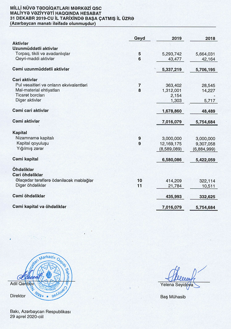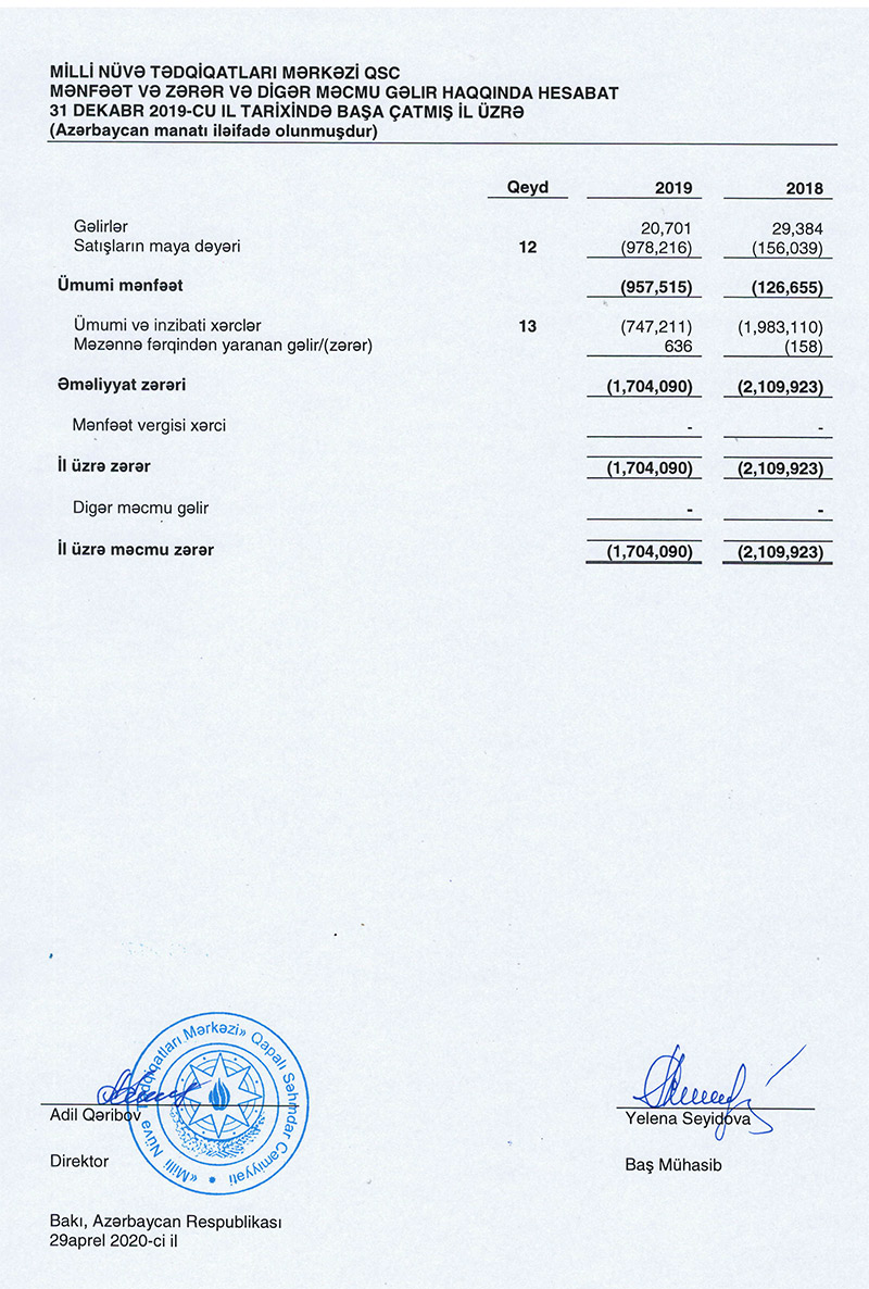 "Milli Nüvə Tədqiqatları Mərkəzi" QSC-nin 2019-cu ili 1 milyon 704 min manat xalis zərər ilə başa vurub.