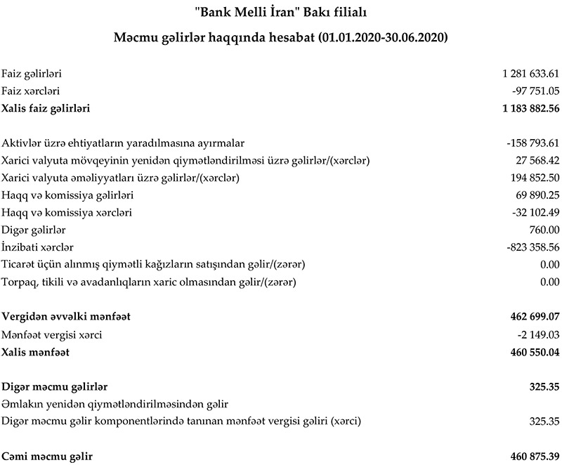 Bank Melli İran Bakı filialı 2020-ci ilin 1-ci yarısında kiçilib.
