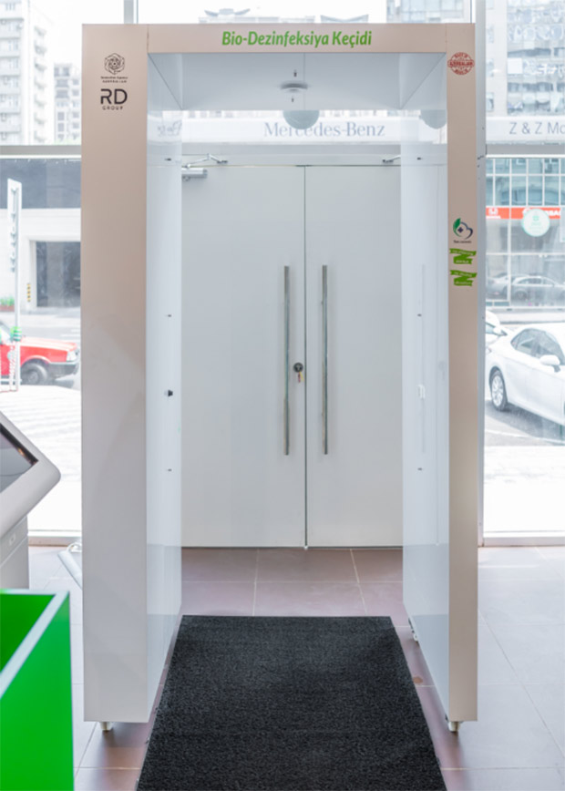 Bu gigiyena qapısı sensorların köməyi ilə avtomatik olaraq püskürmə üsulu ilə çalışır, insanların qapıda 3 saniyə qalması ilə üzlərini, paltarlarını, ayaqqabılarını ani anda dezinfeksiya edir. Dezinfeksiya məhlulu duman buluduna çevrilərək geyimi nəmləndirmədən dərhal bədənə hopur və mövcud mikroorqanizmləri zərərsizləşdirir. İstifadə olunan dezinfeksiya məhlulu insan orqanizmi üçün tam zərərsizdir. Gigiyena qapısında həmçinin üz tanıma infraqırmızı termometr quraşdırılıb. Süni intellekt texnologiyasına əsaslanan bu termometr bədən hərarətini dəqiq müəyyən edir. “Rabitəbank”, “Made in Azerbaijan” brendinin təşviqinə dəstək göstərir və son texnoloji standartlarına cavab verən “Bio-Dezinfeksiya keçidi” də yerli istehsaldır.