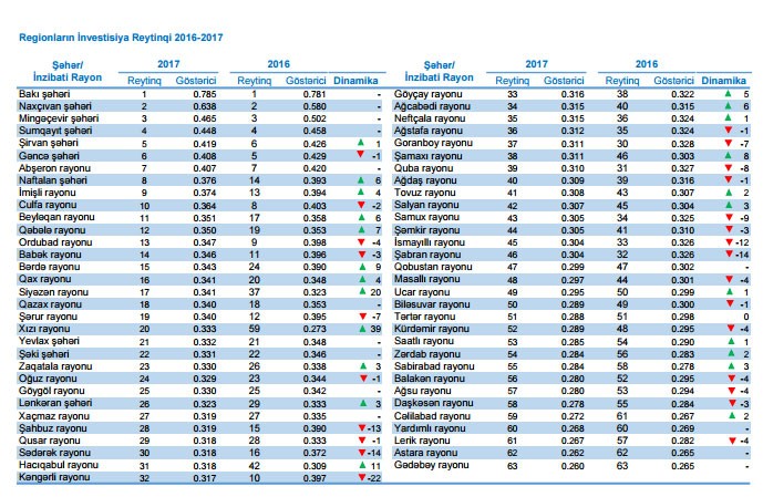 İnvestisiya reytinqinə görə, ən yüksək hədd Bakı şəhəri üzrə müəyyən olunub – 0.785 faiz. Miqyas effektini nəzərə alaraq, paytaxtın I yerdə olması təbii haldır. 2017-ci il üzrə Rayonların İnvestisiya Reytinqinə görə, ilk onluqda Naxçıvan, Mingəçevir, Sumqayit, Şirvan, Gəncə və Naftalan şəhərləri yer alıb. Bundan başqa top-10-luqda Abşeron, İmişli və Culfa rayonları da qərarlaşıb.