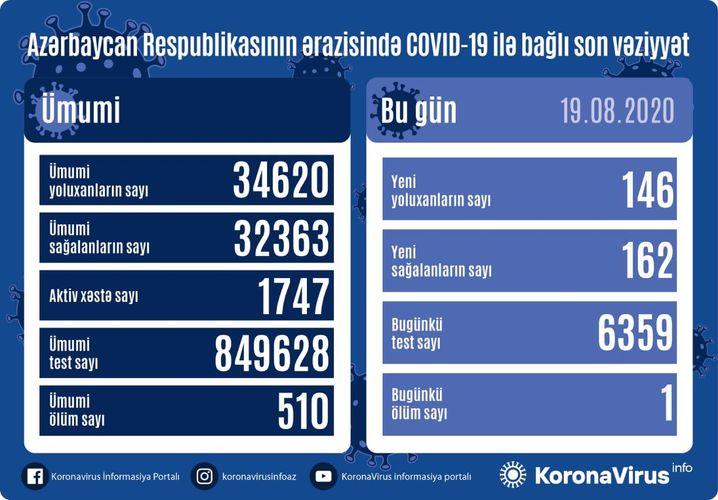 Son 24 saatda Azərbaycan Respublikasında koronavirus (COVID-19) infeksiyasına 146 yeni yoluxma faktı qeydə alınıb, 162 nəfər müalicə olunaraq sağalıb və evə buraxılıb.