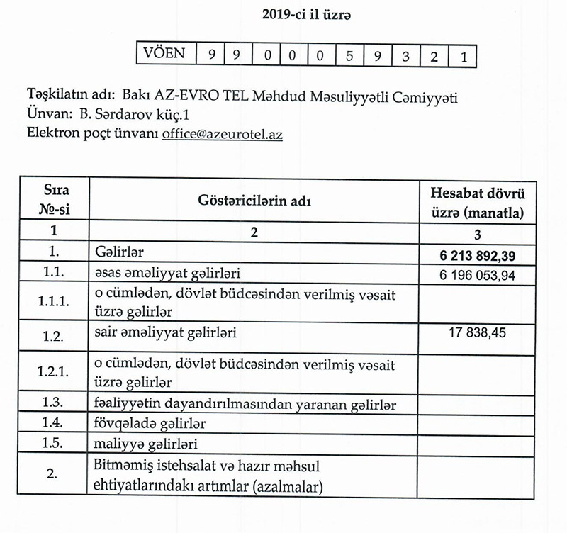 Rabitə operatoru "Az - Euro Tel" MMC 2019-cu ili 560 min manat xalis mənfəət ilə başa vurub. Ötən il 2018-ci illə müqayisədə şirkətin xalis mənfəəti 44,7% artıb. Belə ki, "Az - Euro Tel" 2018-ci ili 387 min manat xalis mənfəət ilə bağlamışdı. Xalis mənfəətin artması gəlirlərin artmasından deyil, xərclərin azalmasından qaynaqlanır.