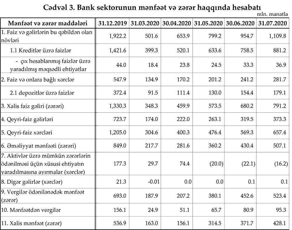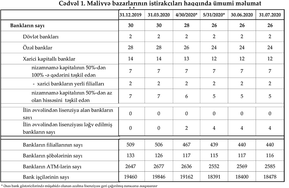 Mərkəzi Bank 31 iyul 2020-ci il tarixinə olan bank sektorunun əsas göstəricilərini açıqladı.