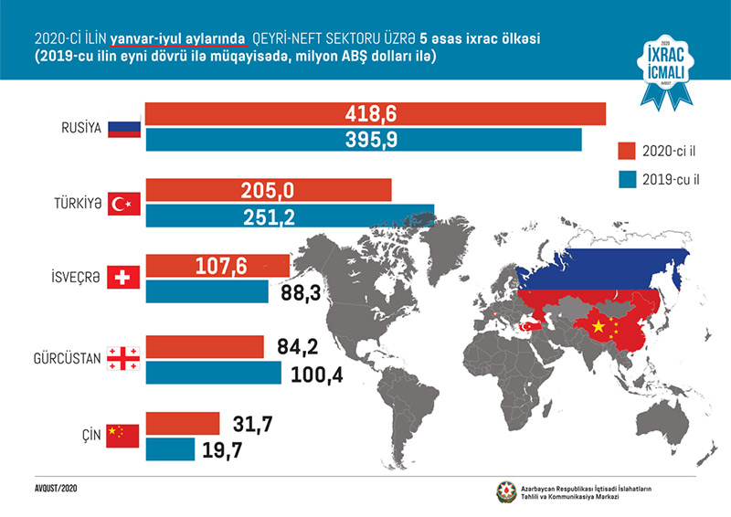 Bu ilin yanvar-iyul ayları ərzində Rusiyaya 418,6 milyon, Türkiyəyə 205 milyon, İsveçrəyə 107,6 milyon, Gürcüstana 84,2 milyon və Çinə 31,7 milyon ABŞ dolları dəyərində qeyri-neft sektoruna aid mal ixrac olunub.