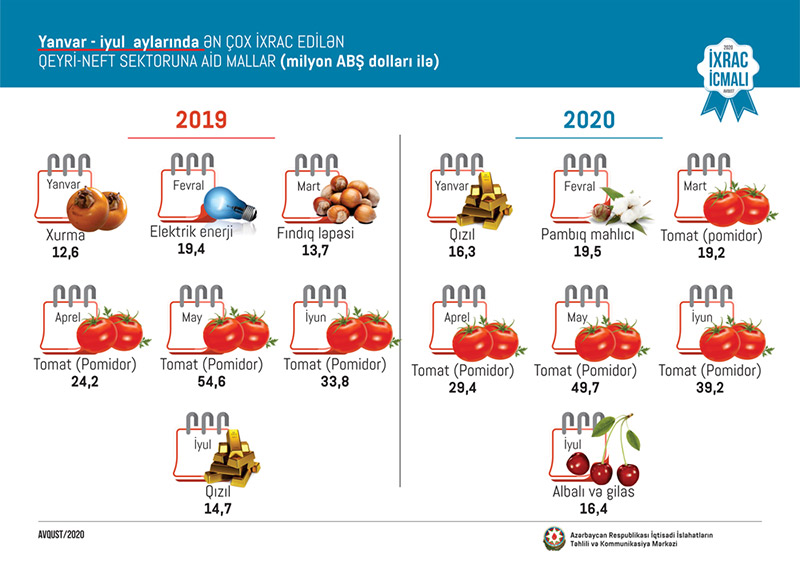 2020-ci ilin yanvar-iyul ayları ərzində ixrac edilən qeyri-neft sektoruna aid malların siyahısında isə pomidor (166,5 milyon ABŞ dolları) birinci, qızıl (sikkə kəsilməsində istifadə olunmayan, digər emal olunmamış formalarda – 96,5 milyon ABŞ dolları) ikinci və pambıq mahlıcı (70,6 milyon ABŞ dolları) üçüncü olub.
