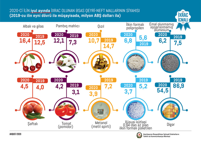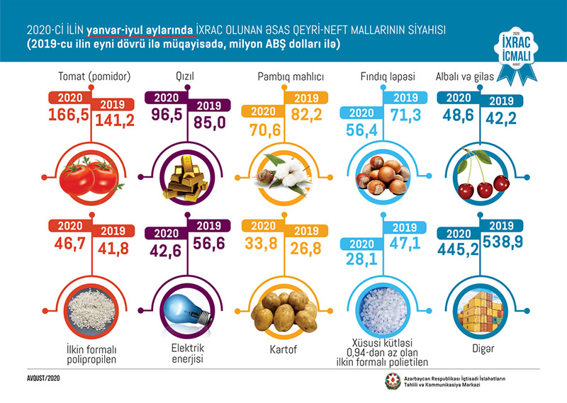 Qeyd edilib ki, 2020-ci ilin yanvar-iyul ayları ərzində (7 ayda) ixrac edilən qeyri-neft sektoruna aid malların siyahısında isə pomidor (166,5 milyon ABŞ dolları) birinci, qızıl (sikkə kəsilməsində istifadə olunmayan, digər emal olunmamış formalarda – 96,5 milyon ABŞ dolları) ikinci və pambıq mahlıcı (70,6 milyon ABŞ dolları) üçüncü olub.