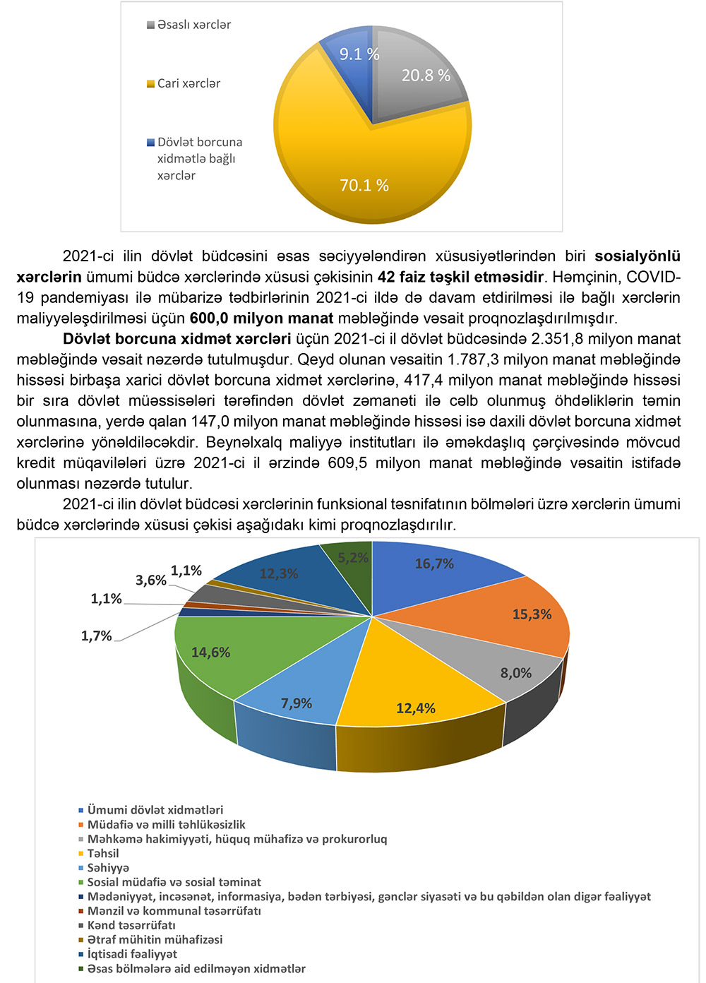 2021-ci ildə dövlət büdcəsinin xərcləri 25 milyard 847 milyon 500 min manat məbləğində proqnozlaşdırılır. Xərclərin 18 milyard 106 milyon 600 min manat və ya 70,1 faizini cari xərclər, 5 milyard 389 milyon 100 min manat və ya 20,8 faizini əsaslı xərclər, 2 milyard 351 milyon 800 min manat və ya 9,1 faizini dövlət borcuna və öhdəliklərinə xidmətlə bağlı xərclər təşkil edir.