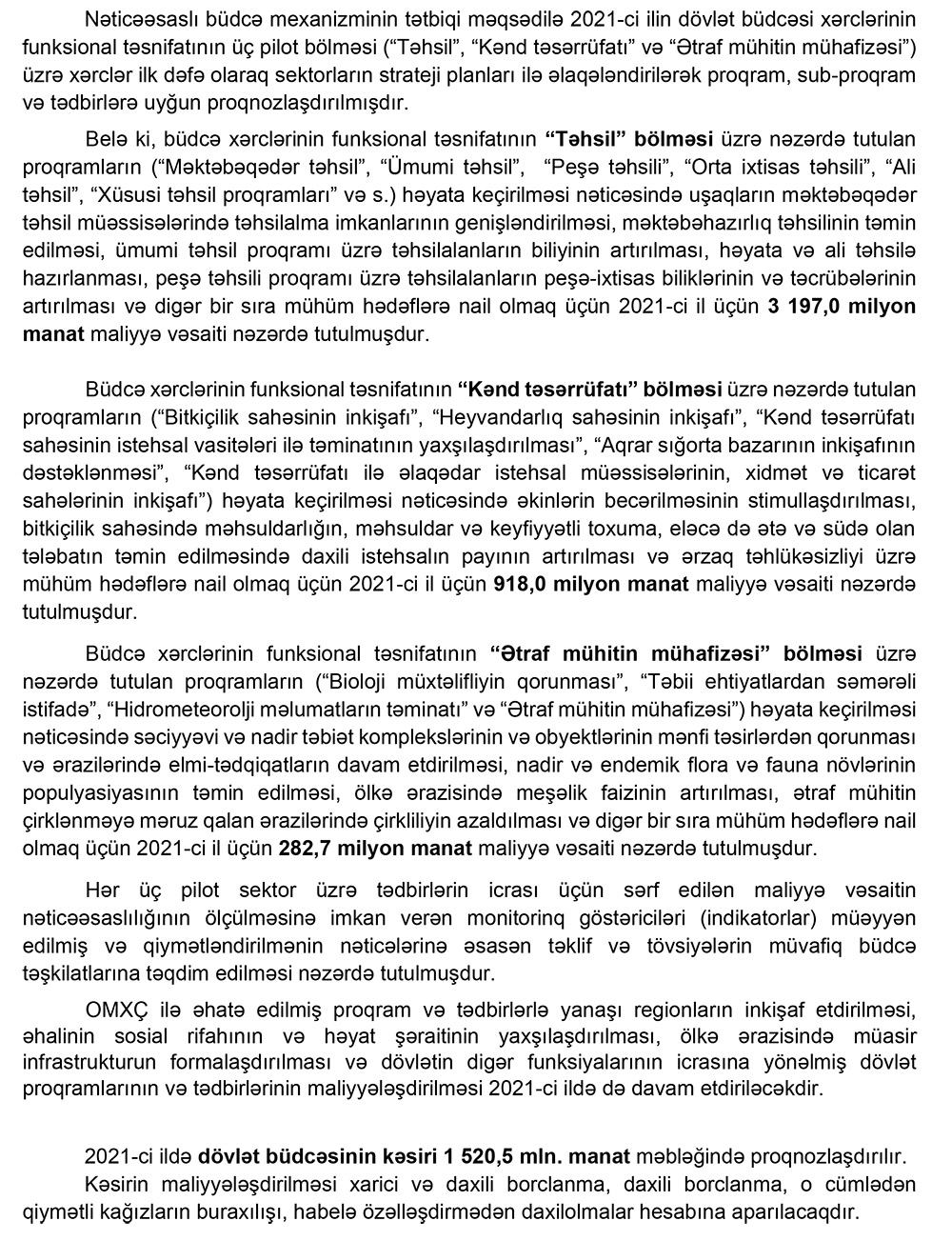 Qeyd edək ki, Azərbaycan Respublikasının 2020-ci il dövlət büdcəsinin gəlirləri 24 milyard 124 milyon min manat, xərcləri 27 milyard 492 milyon 200 min manat (o cümlədən mərkəzləşdirilmiş gəlirləri 23 milyard 359 milyon 465 min manat, yerli gəlirləri 764 milyon 535 min manat, mərkəzləşdirilmiş xərcləri 26 milyard 677 milyon 330 min manat, yerli xərcləri 814 milyon 870 min manat) məbləğində təsdiq edilib.