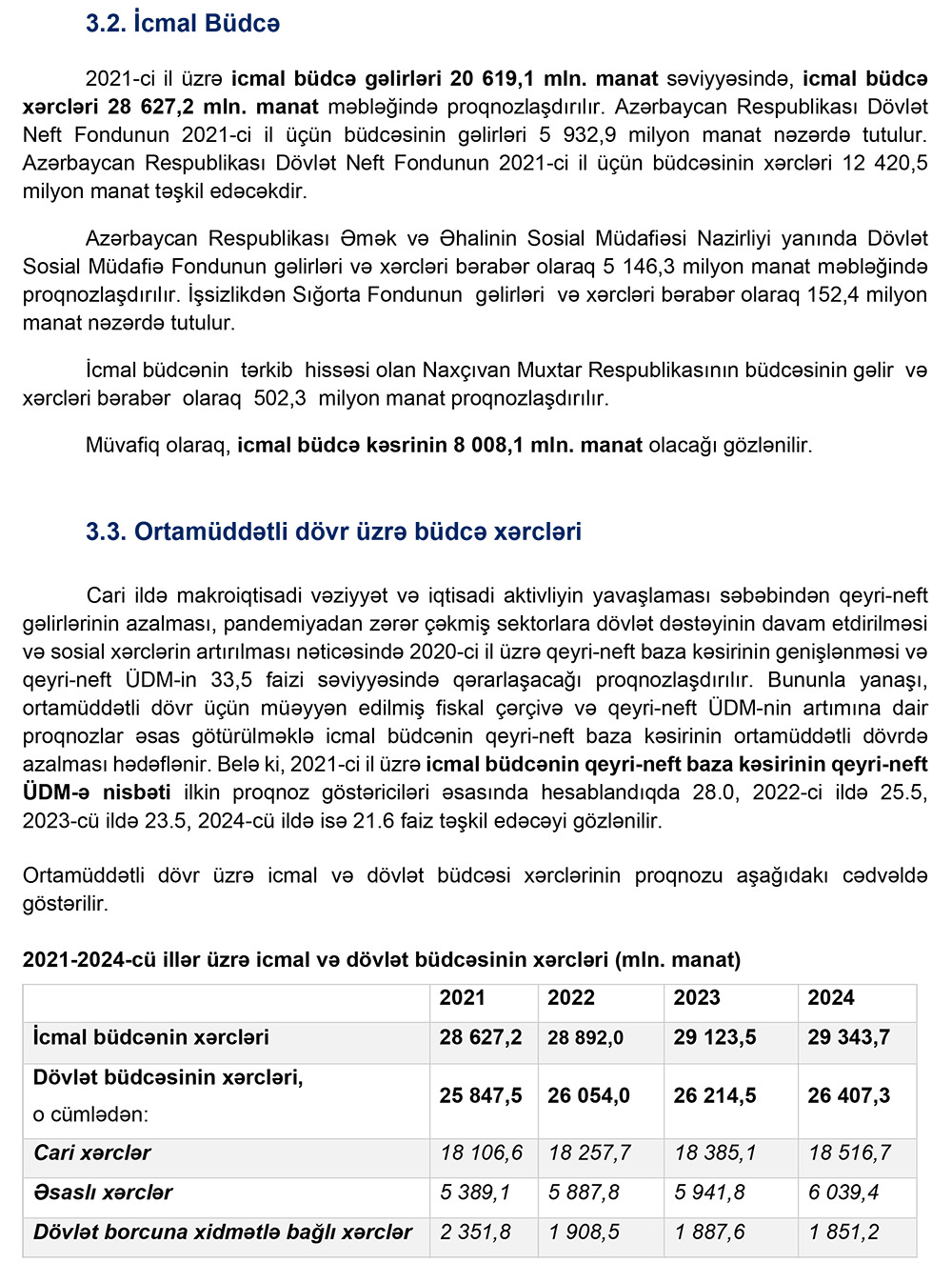 Büdcənin xərcləri azaldılır. Dövlət büdcəsinin xərcləri 2020-ci il üçün 27 milyard 492 milyon 200 min manat təsdiq edilib. Xərclərin 2021-ci ildə 25 milyard 847 milyon 500 min manat olacağı proqnozlaşdırılır.2021-ci ildə dövlət büdcəsinin gəlirləri 24 milyard 327 milyon manat məbləğində proqnozlaşdırılır.