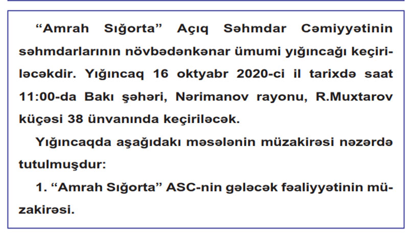 Oktyabrın 16-da, saat 11:00-da “Amrah Sığorta” ASC-nin səhmdarlarının növbədənkənar ümumi yığıncağı keçiriləcək.