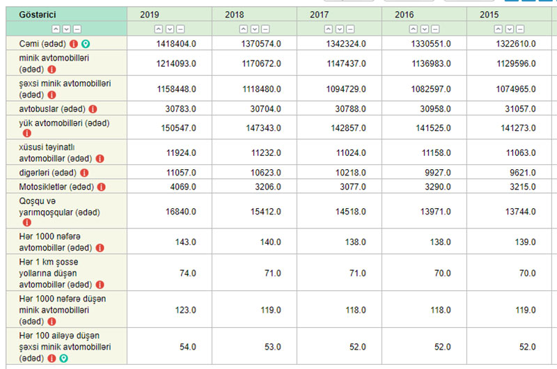 Marja Dövlət Statistika Komitəsinə istinadən xəbər verir ki, ötən il minik avtomobillərinin sayı 43 min 421 ədəd artaraq 2019-cu ilin sonunda 1 milyon 214 min 93 ədəd təşkil edib.