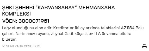 Şəki şəhəri "Karvansaray" Mehmanxana Kompleksi ləğv olunduğunu elan edir.