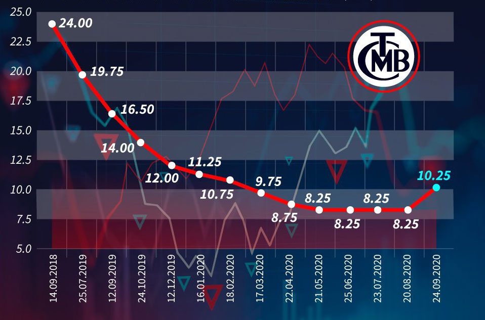 Türkiyə Mərkəzi Bankı (TCMB), Türk Lirəsinin dəyərdən düşməsinin qarşısının alınması üçün bazarlarda yaranan faiz artırımı gözləntisinə cavab verdi. Mərkəzi Bank, sentyabr ayı pul siyasəti yığıncağında faizini 2 bənd artıraraq 8,25%-dən 10,25% səviyyəsinə yüksəltdi. TCMB bu qərarı ilə 2018-ci ilin Sentyabr ayından bu yana ilk dəfə faiz artırmış oldu.Türkiyə Mərkəzi Bankı (TCMB) faiz qərarını açıqladı.