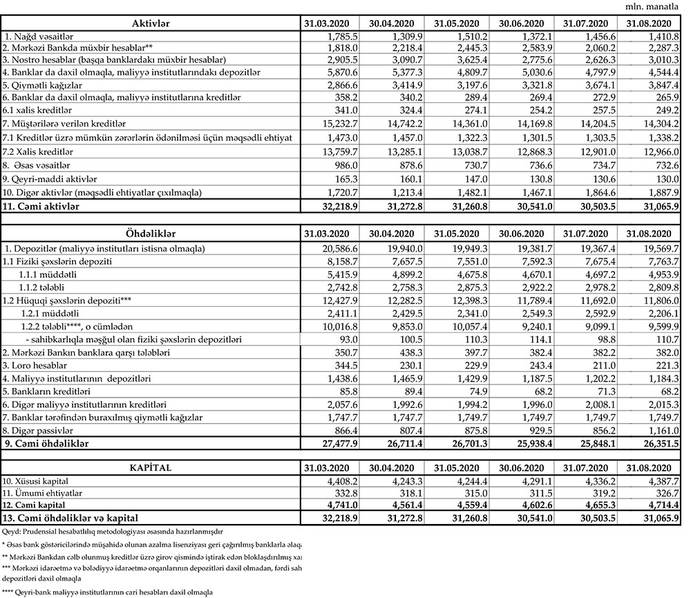 Marja Mərkəzi Banka istinadən xəbər verir ki, 31 Avqust 2020-ci il tarixində müştərilərə verilmiş cəmi kreditlər 14 milyard 304 milyon 200 min manat təşkil edib. İyulun sonunda cəmi kreditlər 14 milyard 204 milyon 500 min manat olmuşdu.