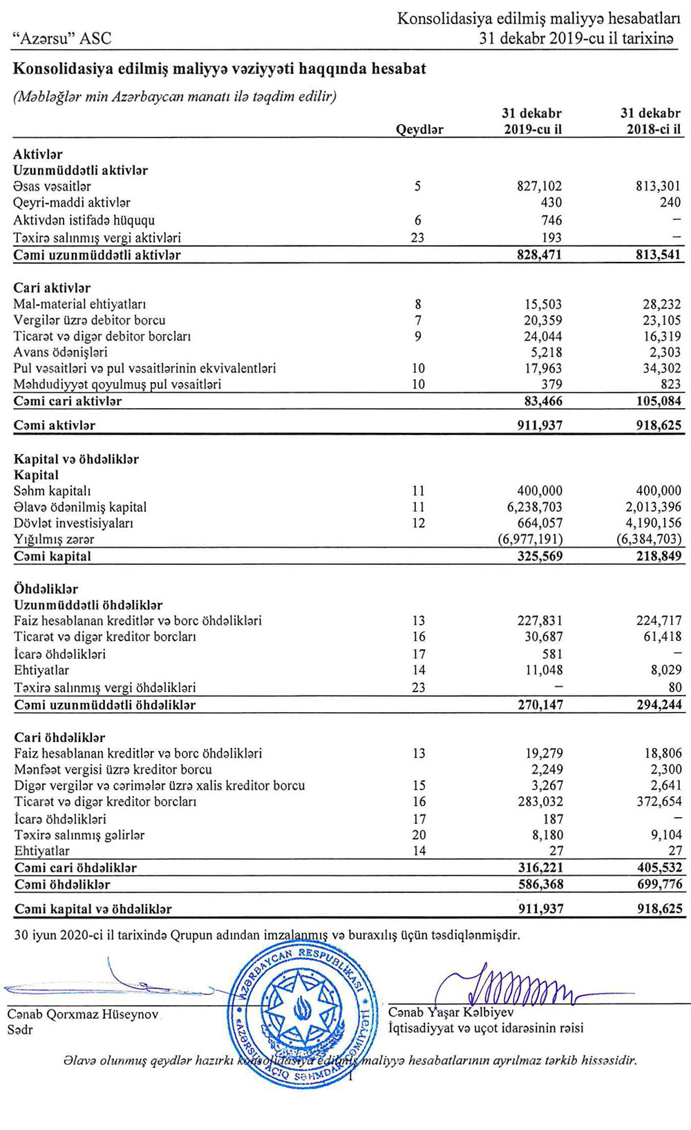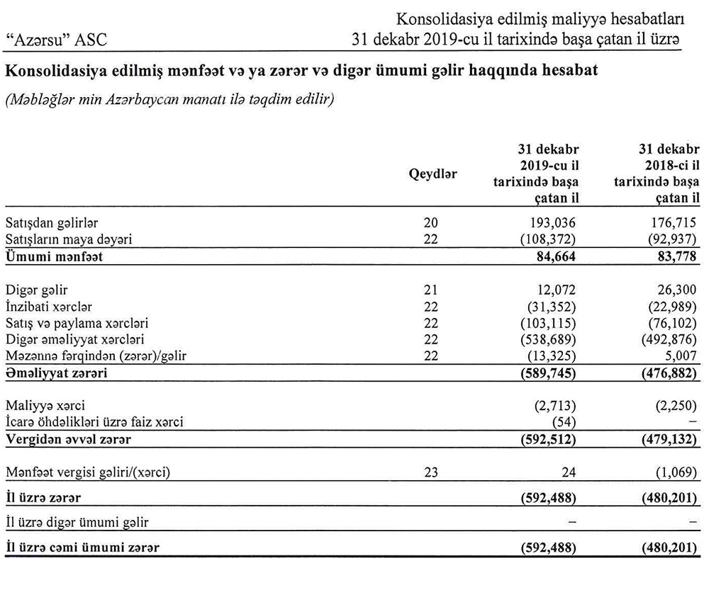 “Azərsu” ASC-nin 31 dekabr 2019-cu il tarixində başa çatan il üzrə Konsolidasiya edilmiş maliyyə hesabatda bildirilir:
