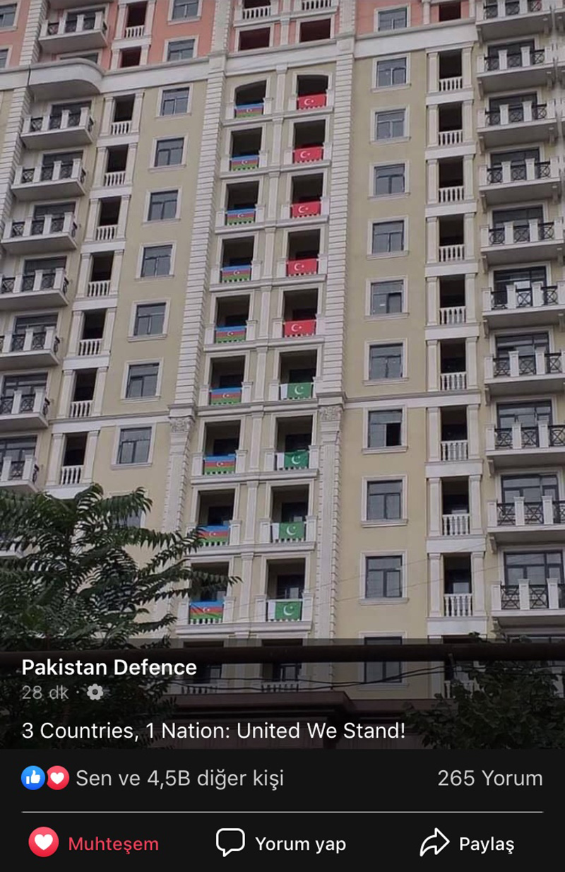 Qeyd edək ki, Pakistan Müdafiə Nazirliyi bu gün öz rəsmi facebook səhifəsində “3 ölkə, 1 millət, birlikdəyik!” başlığı ilə “Renessans Palace”-dakı möhtəşəm bayraq nümayişi haqqında paylaşım edib.
