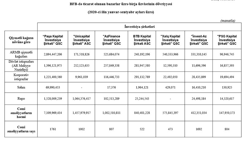 Marja Birjaya istinadən xəbər verir ki, 2020-ci ilin yanvar-sentyabr ayları üzrə “PAŞA Kapital İnvestisiya Şirkəti” QSC 7 milyard 109 milyon 969 min manat dövriyyə ilə 1-ci, "Unicapital İnvestisiya Şirkəti" ASC 1 milyard 457 milyon 980 min manat dövriyyə ilə 2-ci, "AzFinance İnvestisiya Şirkəti" QSC 1 milyard 2 milyon 511 min manat dövriyyə ilə 3-cü yeri tutub.