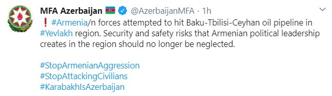 “Ermənistan silahlı qüvvələri Yevlax rayonunda Bakı-Tbilisi-Ceyhan neft kəmərini vurmağa cəhd göstərib”.