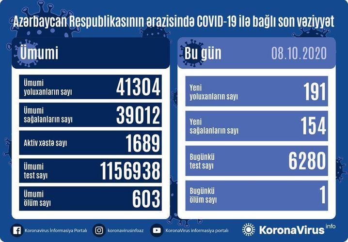Azərbaycan Respublikasında koronavirus (COVID-19) infeksiyasına 191 yeni yoluxma faktı qeydə alınıb, 154 nəfər müalicə olunaraq sağalıb və evə buraxılıb.