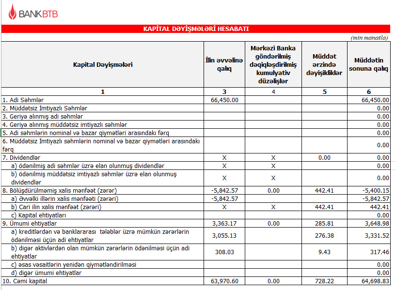 Son 1 ildə Bank BTB-nin cəmi balans kapitalı 5 milyon 99 min manat, 2020-ci ilin 9 ayı ərzində isə 728 min manat artaraq 30 Sentyabr 2020-ci il tarixində 64 milyon 699 min manat təşkil edib.