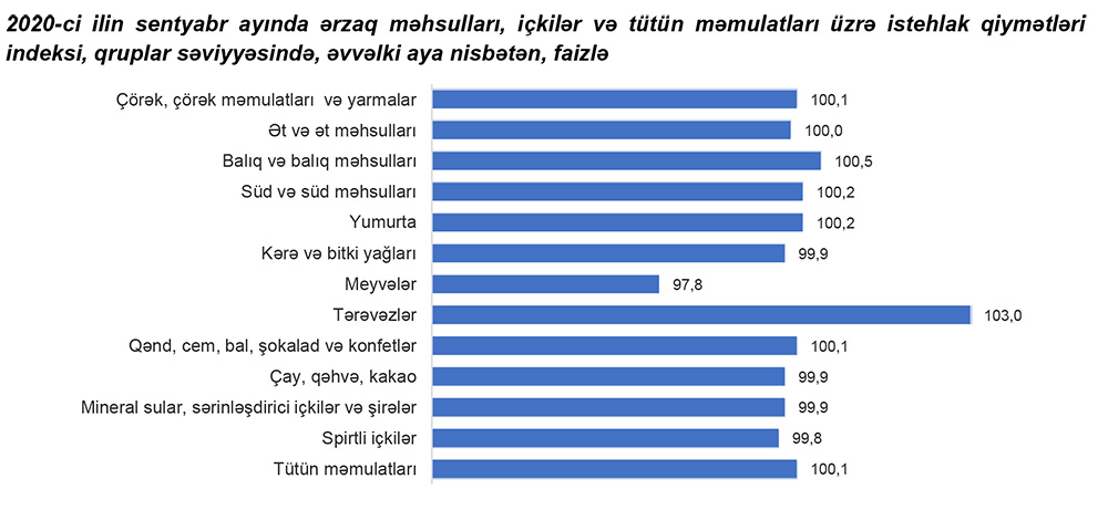 2020-ci ilin sentyabr ayında ərzaq məhsulları, içkilər və tütün məmulatları üzrə istehlak qiymətləri indeksi əvvəlki aya nisbətən 100,2 faiz, əvvəlki ilin sentyabr ayına nisbətən 104,3 faiz təşkil etmişdir.