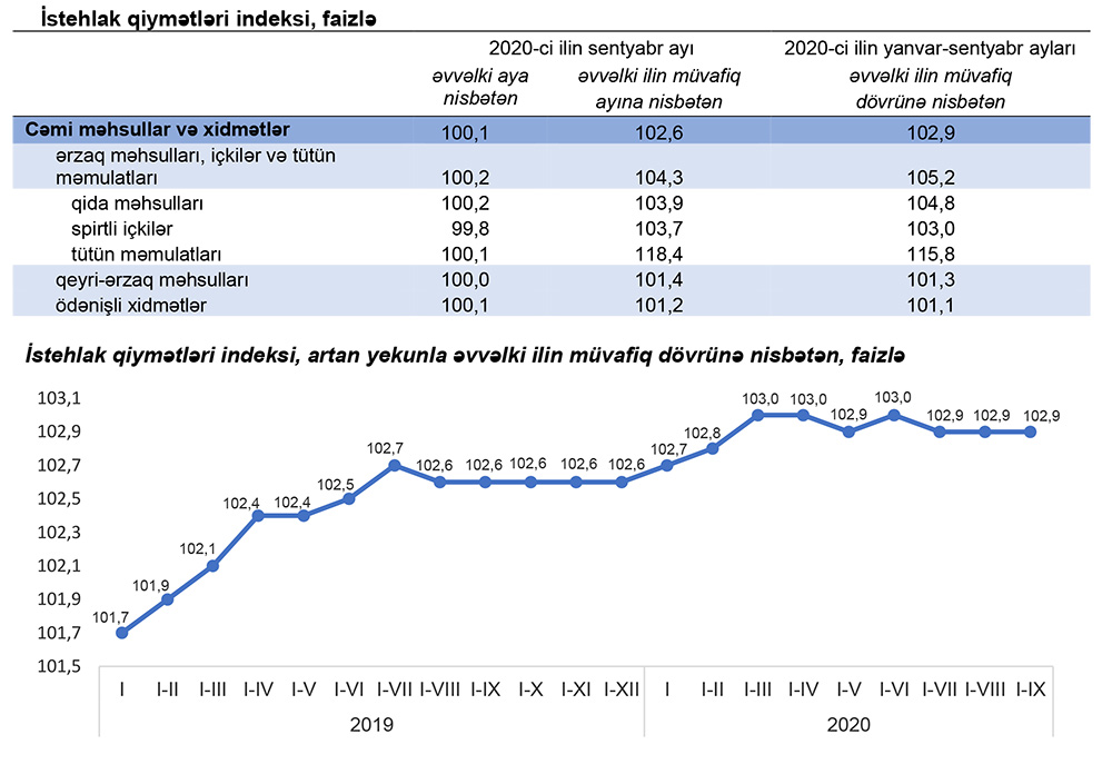 Sentyabrda Azərbaycanda illik inflyasiya 2,9%, aylıq inflyasiya isə 0,1% təşkil edib.2020-ci ilin yanvar-sentyabr aylarında istehlak qiymətləri indeksi 2019-cu ilin yanvar-sentyabr aylarına nisbətən 102,9 faiz, o cümlədən ərzaq məhsulları, içkilər və tütün məmulatları üzrə 105,2 faiz, qeyri-ərzaq məhsulları üzrə 101,3 faiz, əhaliyə göstərilmiş ödənişli xidmətlər üzrə 101,1 faiz təşkil etmişdir.